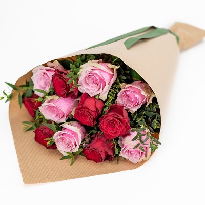Buket med lyserøde og røde roser, smukt indpakket i gavepapir med et silkebånd. Roser er kærlighedens blomst og derfor det perfekte valg, når du vil sende blomster til Valentinsdag. Buketten er et eksklusivt floristhåndværk, og roserne er nøje udvalgt for at sikre høj kvalitet. Buketten leveres af en lokal florist.
